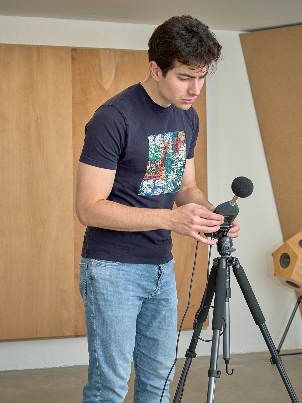 Acoustic engineer Pietro Allegri presses the record button. On the screen, a zig-zag line depicts the sound of the water. This is a typical acoustic test at Geberit headquarters in Rapperswil-Jona (CH). Many of these tests are strictly standardised – including the installation test facility where Pietro Allegri measures the noise of the new Geberit Type 383 fill valve.