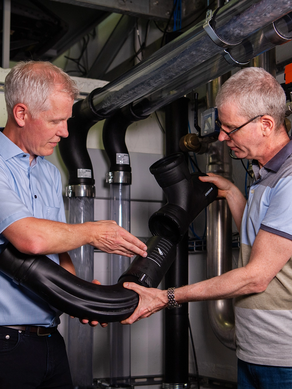 To date, this SuperTube technology has primarily been used in high-rise buildings. However, the tried-and-tested system is now also available for mid-rise apartment buildings – typically with five to eight storeys – specifically using Silent-Pro pipes, which are made of sound-insulating plastic and reduce the noise levels. As the new system has to do without the large Sovent fitting, the developers Rolf Weiss and Richard Kipfer developed the Carve branch, a fitting that directs the water into the stack from the side and creates the desired spiral flow with a column of air.