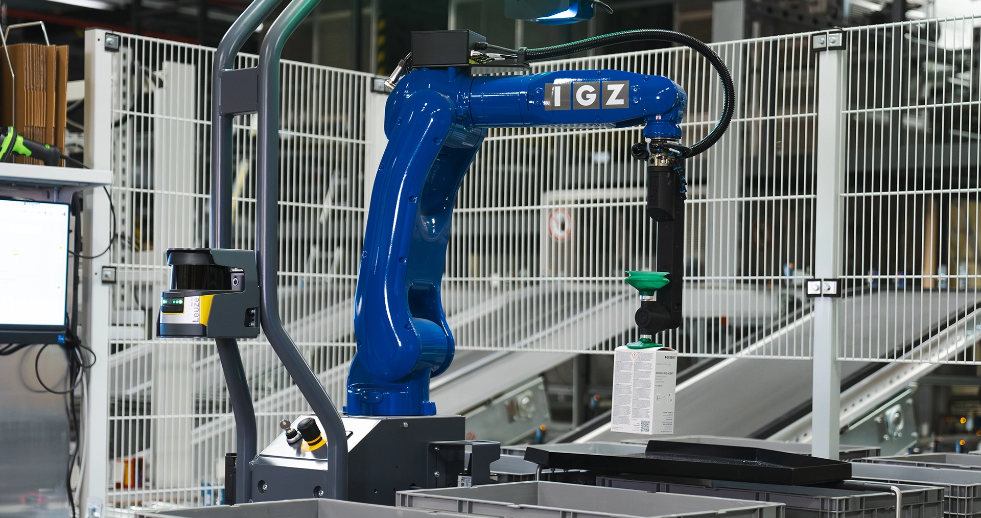 Filling packaging with products is called picking. A robot helps out here at Geberit Group logistics in Pfullendorf (DE). It uses a camera to scan the dimensions of the individual articles and then calculates how to organise these optimally in the target container. It uses suction pads to pick up one article after another and then puts them in the container.