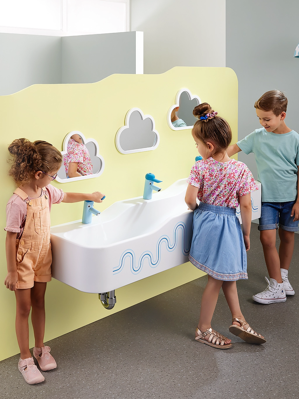 Washbasins for filling with water, WC seats with handles, cheerful colours: the revised Geberit Bambini bathroom series offers childcare centres, kindergartens and schools clever solutions for playful hygiene education with designs that children will love. The products are easy to clean and thus also meet the needs of childcare and cleaning staff. The colour concept gives the sanitary facilities a playful atmosphere.