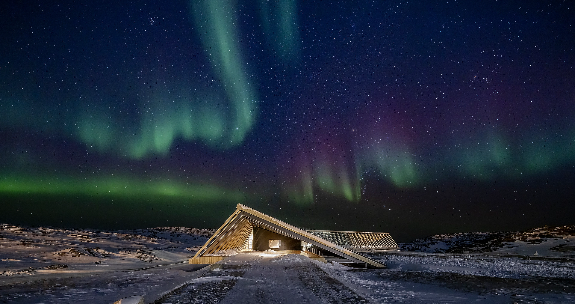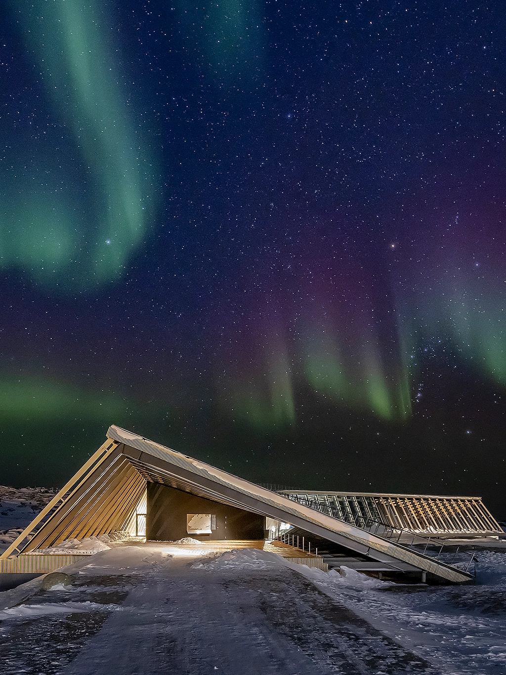 This natural spectacle can be observed from the Ilulissat Icefjord Centre. The visitor centre is situated on a secluded plateau on the edge of the third largest town in Greenland. The building in the shape of a wing blends in excellently with the breathtaking landscape, but also places special demands on the construction.
