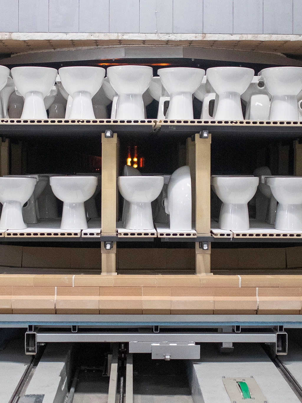 Spread across two levels, the rows of WC ceramic appliances wait their turn to travel through the brand-new, 120-metre-long kiln at temperatures of 1,200 °C. Once they reach the end of the tunnel, the blanks have become fired, durable ceramic appliances.